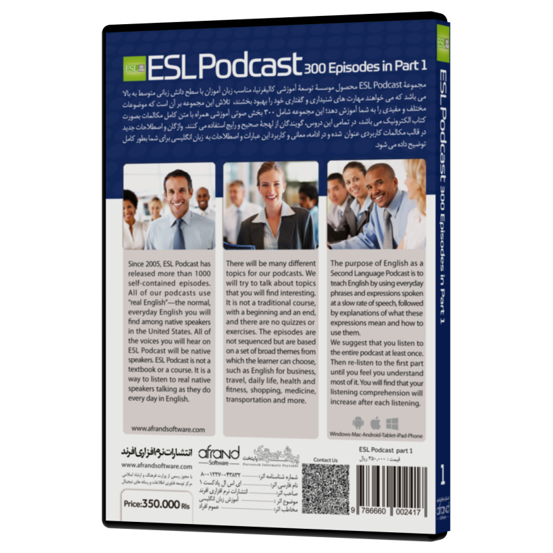 مجموعه ESL Podcast محصول موسسه توسعه آموزشی کالیفرنیا، مناسب زبان آموزان با سطح دانش زبانی متوسط به بالا می باشد که می خواهند مهارت های شنیداری و گفتاری خود را بهبود بخشند، تلاش این مجموعه بر آن است که موضوعات مختلف و مفیدی را به شما آموزش دهد؛ این مجموعه شامل 300 بخش صوتی آموزشی همراه با متن کامل مکالمات بصورت کتاب الکترونیک می باشد، در تمامی این دروس، گویندگان از لهجة صحیح و رایج استفاده می کنند. واژگان و اصطلاحات جدید در قالب مکالمات کاربردی عنوان شده و در ادامه، معانی و کاربرد این عبارات و اصطلاحات به زبان انگلیسی برای شما بطور کامل توضیح داده می شود.