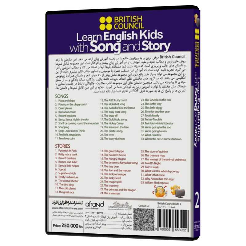 British Council موفق ترین و به روزترین منابع را در زمینه آموزش زبان ارائه می دهد. این سازمان با ارائه روش های نوین و مطالب جدید و مفید آموزشی در امر آموزش زبان پیشتاز و اثرگذار است. این مجموعه شامل شعرها و داستان های جالب و پرباری است که فرزند دلبند شما مشتاقانه بارها آنها را تماشا می کند و مطالب آموزشی را فرا می گیرد. تجربه ثابت کرده است که آموزش غیر مستقیم همراه با موسیقی و تصاویر جذاب تاثیر بیشتری دارد؛ از این رو این مجموعه می تواند بسیار مفید واقع شود. این مجموعه شامل بیش از 70 عنوان شعر و داستان همراه با زیرنویس انگلیسی می باشد که در گروه های مختلفی نظیر اعداد، حروف، تلفظ، بازی، واژگان، سبک زندگی و ... از سطح مبتدی تا پیشرفته می باشد.